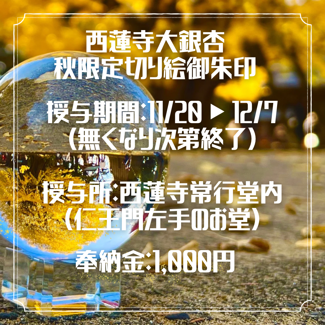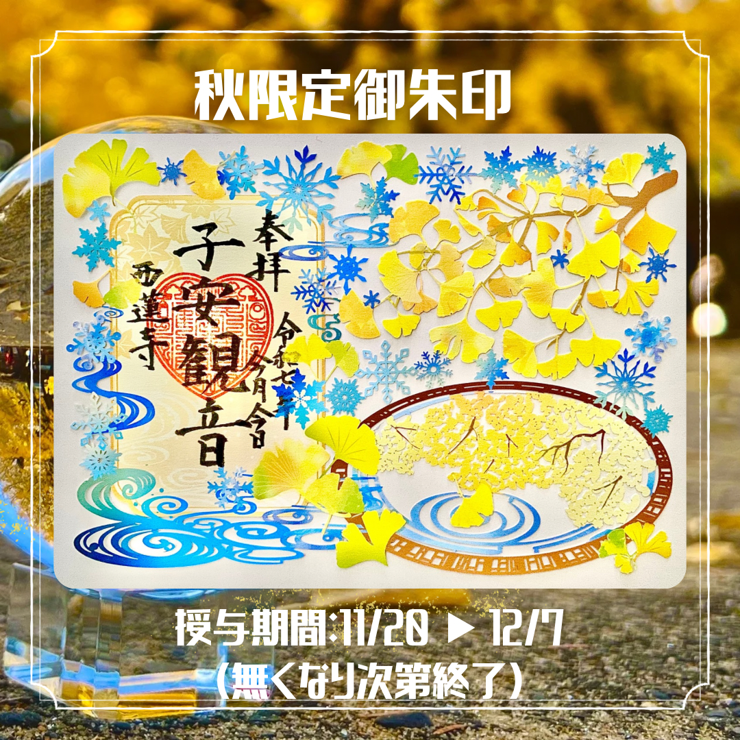 西蓮寺大銀杏秋限定切り絵御朱印 今年も、大銀杏の黄葉の時期が近づいてまいりました。 今年の秋限定御朱印は、銀杏吹雪と水面に写る銀杏を表現した切り絵の御朱印です。 授与期間:2025年11月20日(木)~12月7日(日)まで ※なくなり次第終了 奉納金:1,000円 是非この機会に、大銀杏の黄葉と御朱印を授与されてみては如何でしょうか。